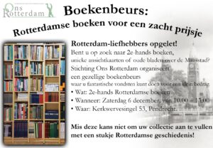 Stichting Ons Rotterdam organiseert regelmatig een boekenbeurs. Bij deze gelegenheid kunt u voor een zacht prijsje diverse populair historische boeken over Rotterdam kopen. Tevens zijn we in bezit van honderden oude prentbriefkaarten, waarmee u uw verzameling kunt aanvullen. Voor de liefhebbers zijn ook oudere uitgaven van ons tijdschrift te koop.